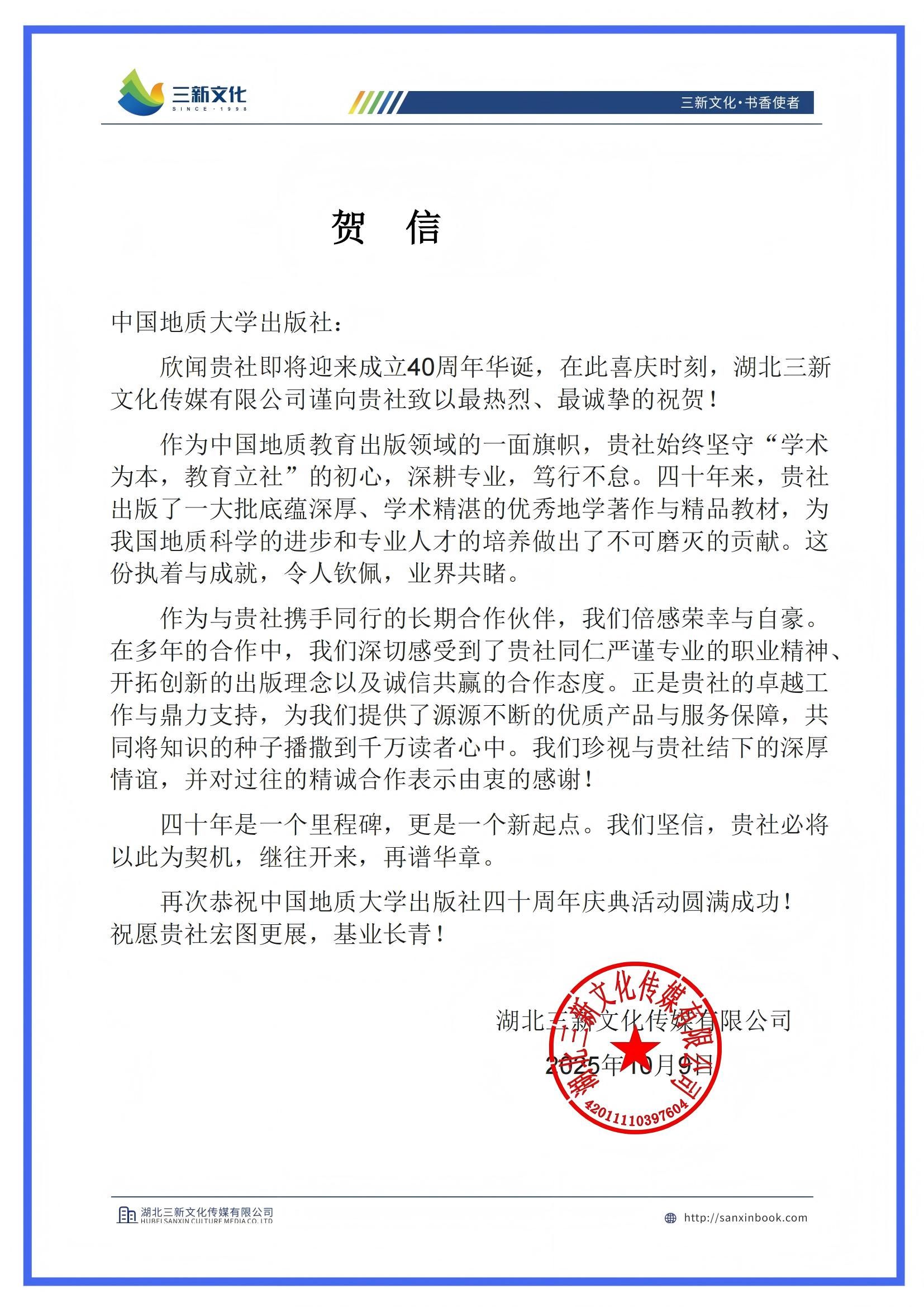 湖北三新文化传媒有限公司在贺信中表示,地大社作为中国地质教育出版领域的一面旗帜,深耕专业,笃行不怠,出版了一大批底蕴深厚、学术精湛的优秀地学著作与精品教材,为我国地质科学的进步和专业人才的培养做出了不可磨灭的贡献。这份执着与成就,令人钦佩,业界共睹。