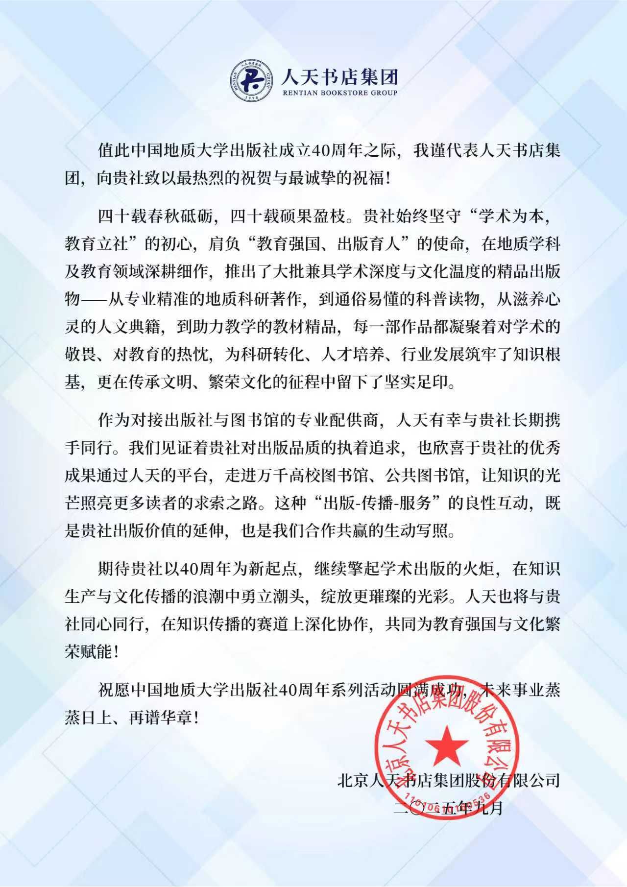 北京人天书店集团股份有限公司在贺信中表示,地大社肩负“教育强国、出版育人”的使命,在地质学科及教育领域深耕细作,推出了大批兼具学术深度与文化温度的精品出版物。从专业精准的地质科研著作,到通俗易懂的科普读物;从滋养心灵的人文典籍,到助力教学的教材精品,每一部作品都凝聚着对学术的敬畏、对教育的热忱,为科研转化、人才培养、行业发展筑牢了知识根基,更在传承文明、繁荣文化的征程中留下了坚实足印。