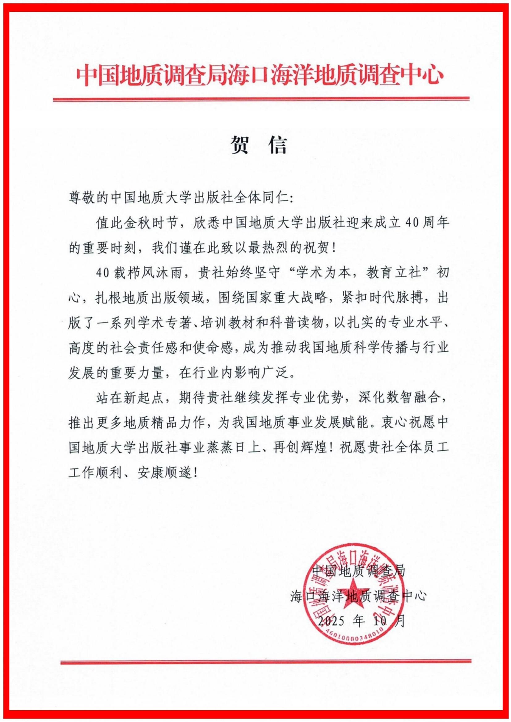 中国地质调查局海口海洋地质调查中心在贺信中指出,四十年来,地大社始终扎根地质出版领域,围绕国家重大战略,紧扣时代脉搏,出版了一系列具有广泛影响力的学术著作、培训教材和科普读物,已成为推动我国地质科学传播与行业发展的重要力量,行业影响广泛。贺信期待我社以建社40周年为新起点,继续发挥专业优势,深化数智融合,不断推出更多高质量的地质精品力作,为我国地质事业的高质量发展持续赋能。