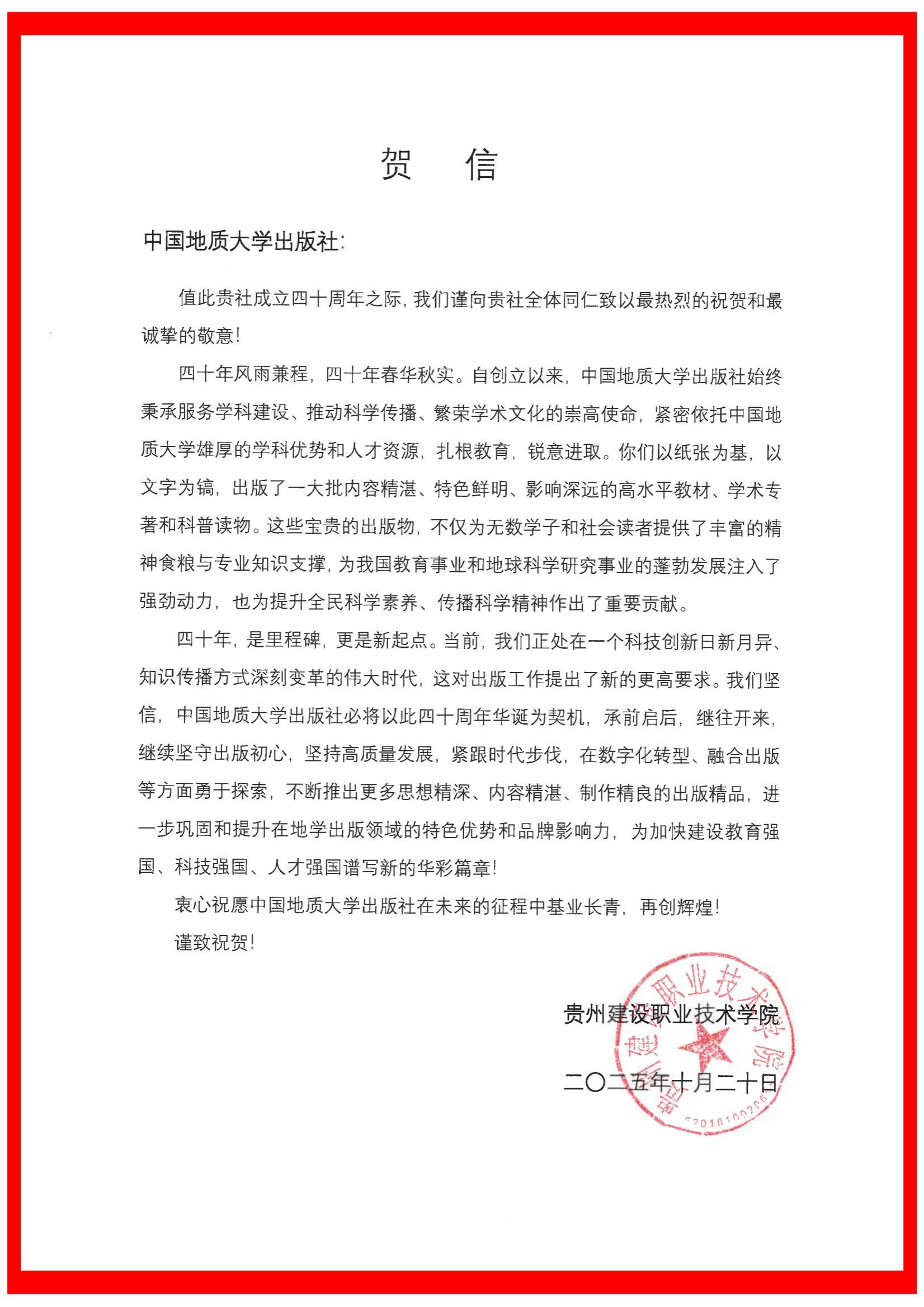 贵州建设职业技术学院在贺信中表示,地大社始终秉承坚守服务学科建设、推动科学传播、繁荣学术文化的崇高使命,紧密依托中国地质大学雄厚的学科优势和人才资源,出版了一大批内容精湛、特色鲜明、影响深远的高水平教材、学术专著和科普读物,为无数学子和社会读者提供了丰富的精神食粮与专业知识支撑,为我国教育事业和地球科学研究的蓬勃发展注入了强劲动力,也为提升全民科学素养、弘扬科学精神作出了重要贡献。希望我社坚守出版初心,在数字化转型与融合出版领域勇于探索,持续推出更多思想精深、内容精湛、制作精良的出版精品,进一步巩固地学出版领域的特色优势,为加快建设教育强国、科技强国、人才强国谱写新的华彩篇章。