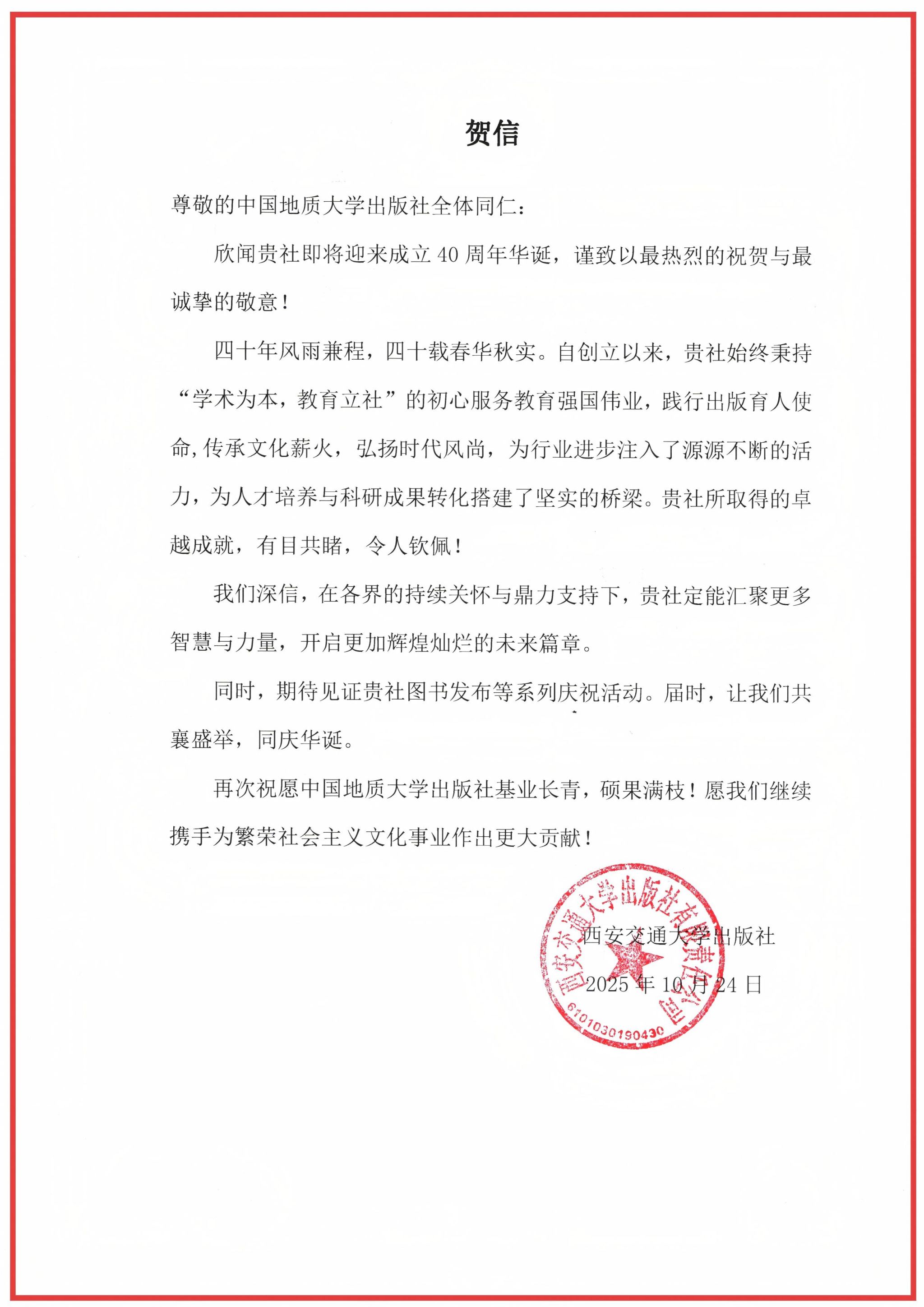 西安交通大学出版社在贺信中表示,中国地质大学出版社以“学术为本,教育立社”的初心服务教育强国伟业,践行出版育人使命,传承文化薪火,弘扬时代风尚,为行业进步注入了源源不断的活力,为人才培养与科研成果转化搭建了坚实的桥梁,相信地大社定能汇聚更多智慧力量,开启更加灿烂的未来。