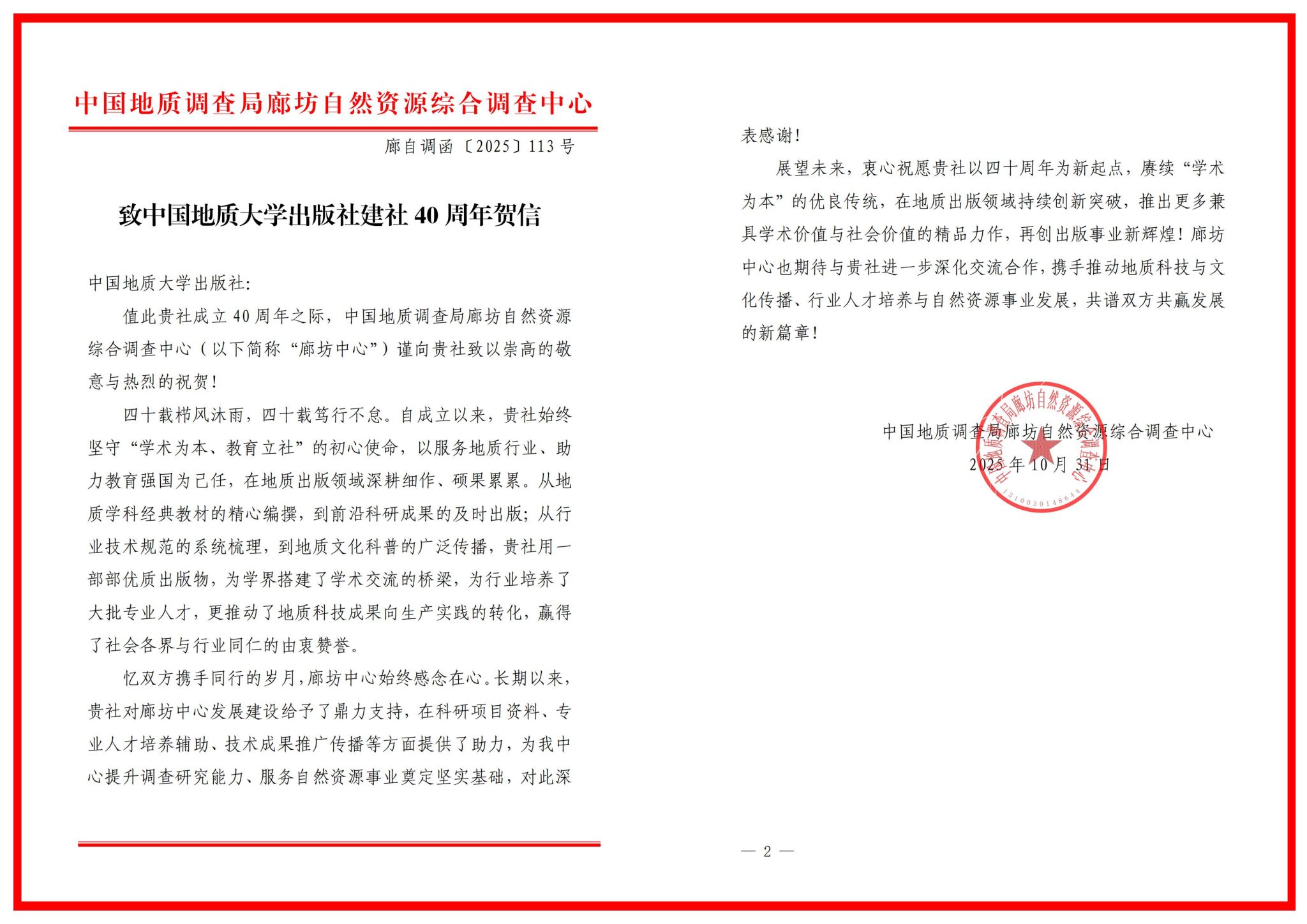 中国地质调查局廊坊自然资源综合调查中心在贺信中写道:“四十载栉风沐雨,四十载笃行不怠”,高度肯定出版社坚守“学术为本、教育立社”的初心使命。贺信表示,从地质经典教材编撰到前沿科研成果出版,从行业规范梳理到地质科普传播,出版社以优质出版物搭建学术桥梁、培育专业人才,推动科技成果向实践转化,赢得行业广泛赞誉,希望“深化交流合作,共谱共赢新篇章”