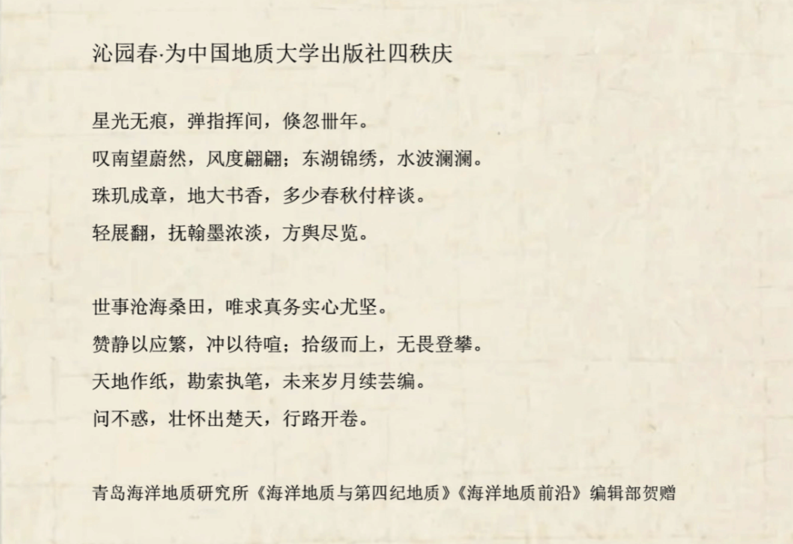 青岛海洋地质研究所《海洋地质与第四纪地质》《海洋地质前沿》编辑部则以《沁园春・为中国地质大学出版社四秩庆》相赠,用“珠玑成章,地大书香”“天地作纸,勘索执笔” 等词句,褒扬出版社扎根地学出版、传承学术薪火的职业虔诚与“求真务实心尤坚”的专业品格。