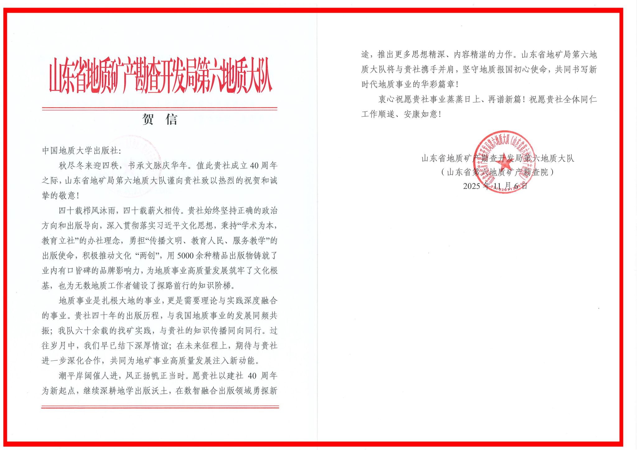 山东省地质矿产勘查开发局第六地质大队在贺信中表示,四十年栉风沐雨,四十年薪火相传,地大社始终坚持正确的政治方向和出版导向,深入贯彻落实习近平文化思想,勇担“传播文明、教育人民、服务教学”的出版使命,积极推动文化“两创”,用5000余种精品出版物铸就了业内有口皆碑的品牌影响力,为地质事业高质量发展筑牢了文化根基,也为无数地质工作者铺设了探路前行的知识阶梯,希望携手并肩,共同书写新时代地质事业的华彩篇章。
