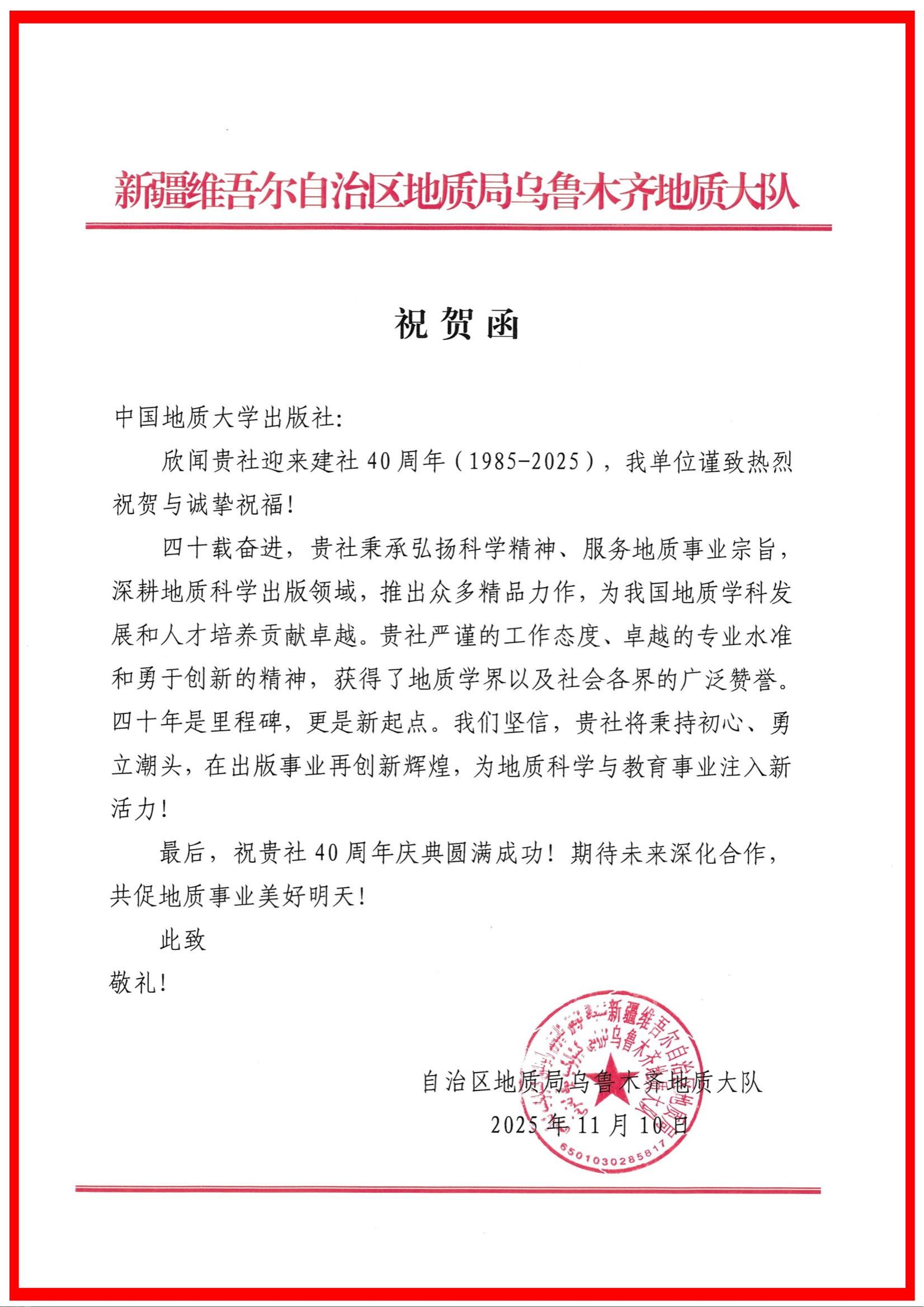 新疆维吾尔自治区地质局乌鲁木齐地质大队在贺信中表示,地大社秉承弘扬科学精神、服务地质事业宗旨,深耕地质科学出版领域,推出众多精品力作,为我国地质学科发展和人才培养贡献卓越。严谨的工作态度、卓越的专业水准和勇于创新的精神,获得了地质学界以及社会各界的广泛赞誉,希望地大社再创新辉煌,为地质科学与教育事业注入新活力。