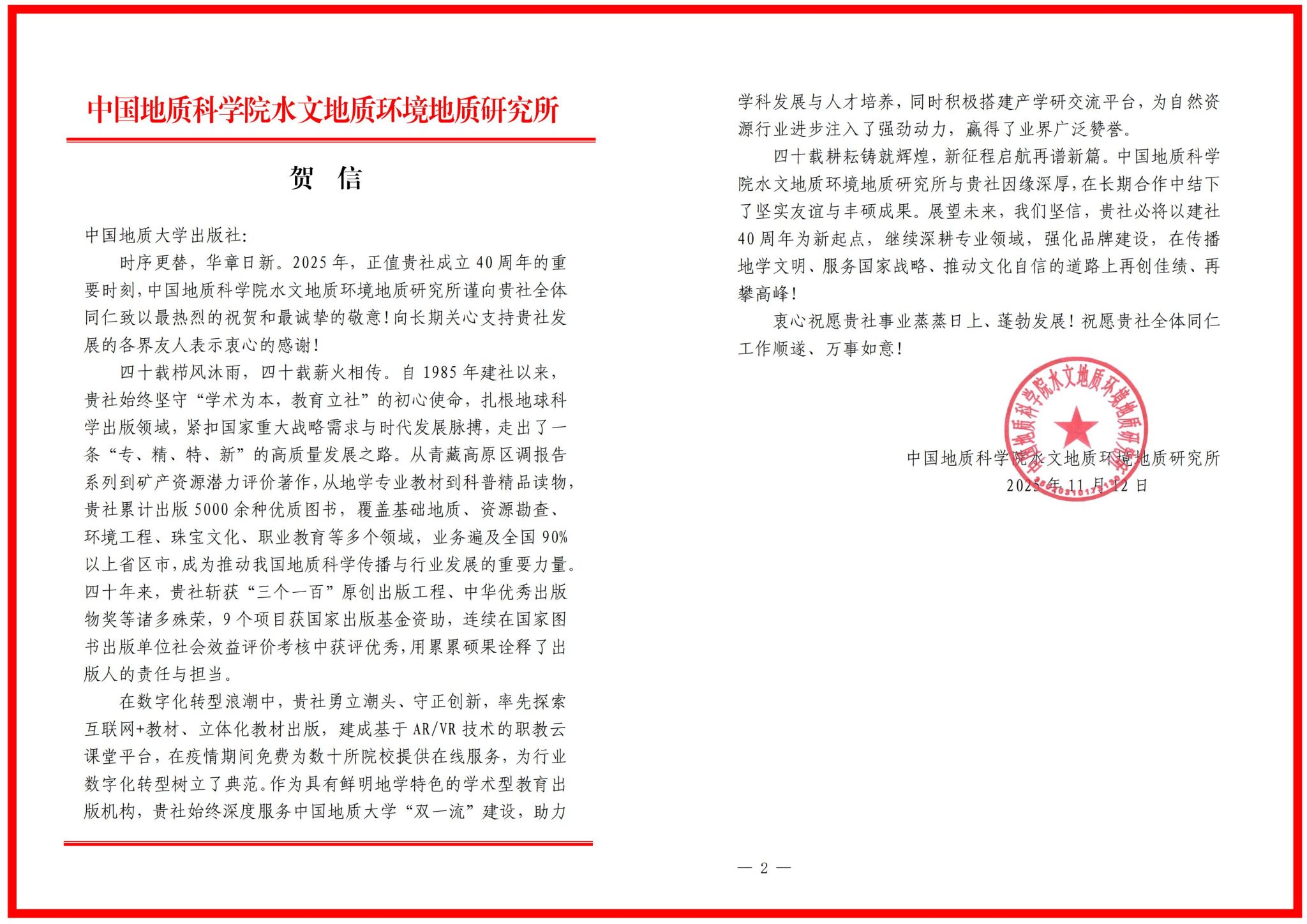 中国地质科学院水文地质环境地质研究所则在贺信中充分肯定了出版社四十年来的发展成就。贺信表示,地大出版社自1985年成立以来,紧扣国家战略与时代脉搏,走出了一条“专、精、特、新”的高质量发展之路,荣获了“三个一百”原创出版工程、中华优秀出版物奖等多项荣誉。两单位在长期合作中结下了坚实友谊与丰硕成果,坚信继续深耕专业领域,强化品牌建设,在传播地学文明、服务国家战略、推动文化自信的道路上再创佳绩。