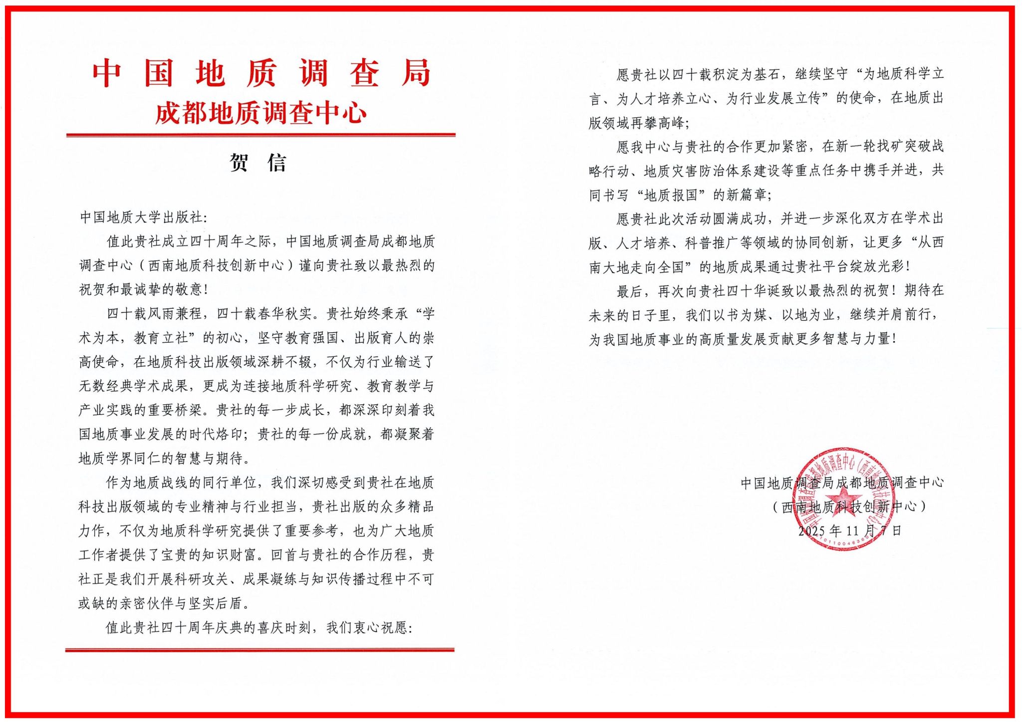 中国地质调查局成都地质调查中心在贺信中回顾了与中国地质大学出版社长期以来的紧密合作,表示地大社坚守教育强国、出版育人的使命,在地质科技出版领域深耕不辍,成为连接地质科研、教学与产业实践的重要桥梁。出版社出版的众多精品力作,为地质科学研究与一线工作提供了重要支撑,是地质战线不可或缺的合作伙伴。希望合作更加紧密,在新一轮找矿突破战贺信略行动、地质灾害防治体系建设等重点任务中携手并进,共同书写“地质报国”的新篇章;进一步深化双方在学术出版、人才培养、科普推广等领域的协同创新,让更多“从西南大地走向全国”的地质成果绽放光彩。