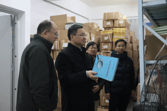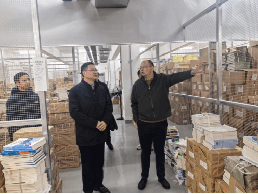 社长江广长汇报了新书库运行布局、安全管理等情况。刘杰书记对新书库整体环境和运行秩序给予充分肯定。随后,刘杰书记逐层查看了图书存放具体情况,仔细询问库房管理与运行情况。他表示,要珍惜资源空间,管好用好阵地,最大限度提升运行与发展效益。他还就进一步加强图书价值实现与行业应用,加强书库全方位安全管理提出明确要求。