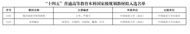 (通讯员 胡娟)近日,教育部高等教育司发布《关于“十四五”普通高等教育本科国家级规划教材拟入选名单的公示》,中国地质大学出版社出版的《煤田地质学简明教程》《首饰概论》成功入选,再次彰显了出版社在特色学科教材建设领域的突出成果。